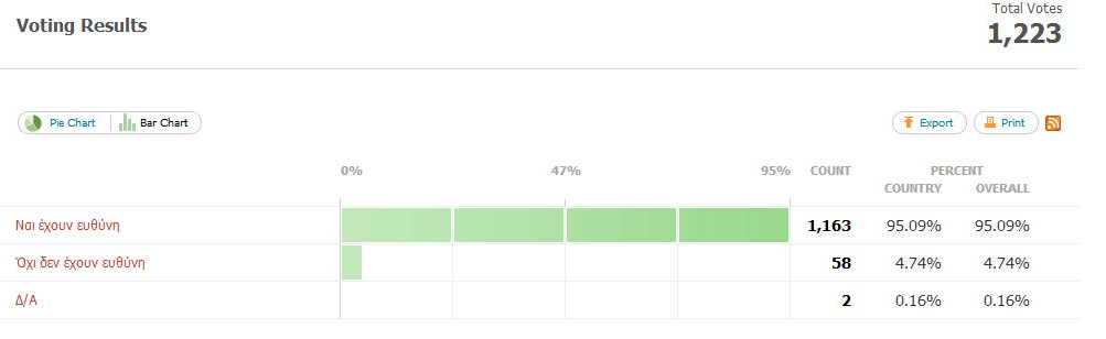 Όλα τα παραπάνω επιβεβαιώνει το γκαλοπ που δημοσιεύεται στο Blog πρωτΑΓΩΝΙΣΤΗΣ, το οποίο και σας παραθέτω. Το ερώτημα που τέθηκε στο γκάλοπ ήταν: "Έχουν ευθύνη οι υπουργοί τα δύο τελευταία χρόνια που δεν σήριξαν τις αποφάσεις της κυβέρνησης"; Απάντησαν : Ναι έχουν ευθύνη 95.09% 1,163 ψήφοι , Όχι δεν έχουν ευθύνη 4.74% , 58 ψήφοι Δ/Α 0.16% ,2 ψήφοι, Συνολικοί ψήφοι: 1,223.